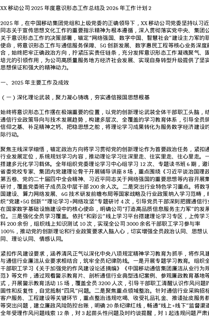 XX移动公司2025年度意识形态工作总结及2026年工作计划2