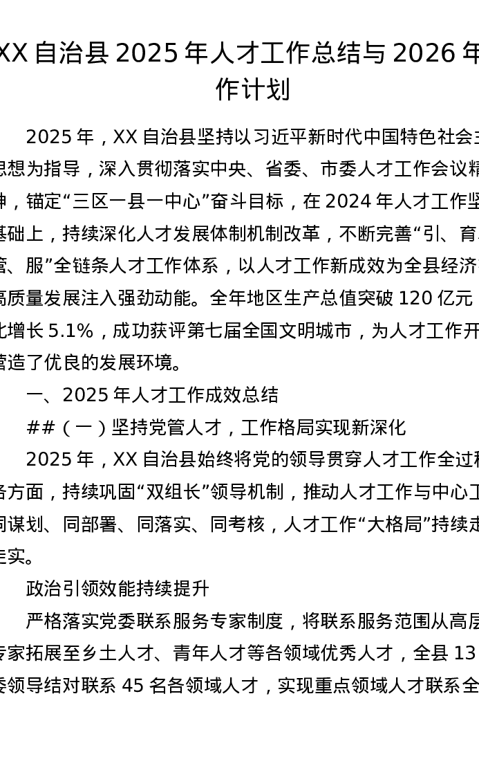 XX自治县2025年人才工作总结与2026年工作计划(7470字)