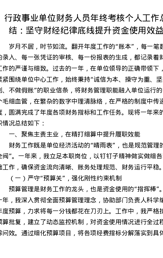 行政事业单位财务人员年终考核个人工作总结:坚守财经纪律底线 提升资金使用效益