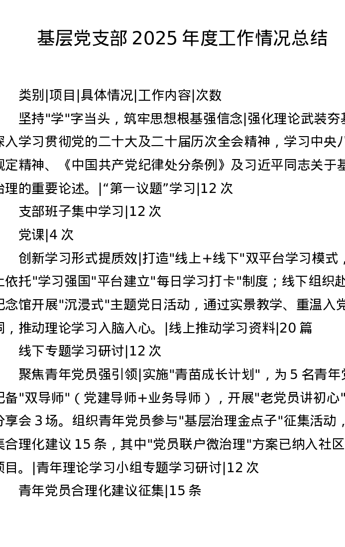 基层党支部2025年度工作情况总结(表格版)