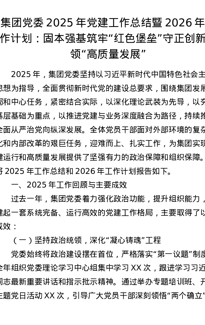 集团党委 2025 年党建工作总结暨 2026 年工作计划:固本强基筑牢“红色堡垒” 守正创新引领“高质量发展”
