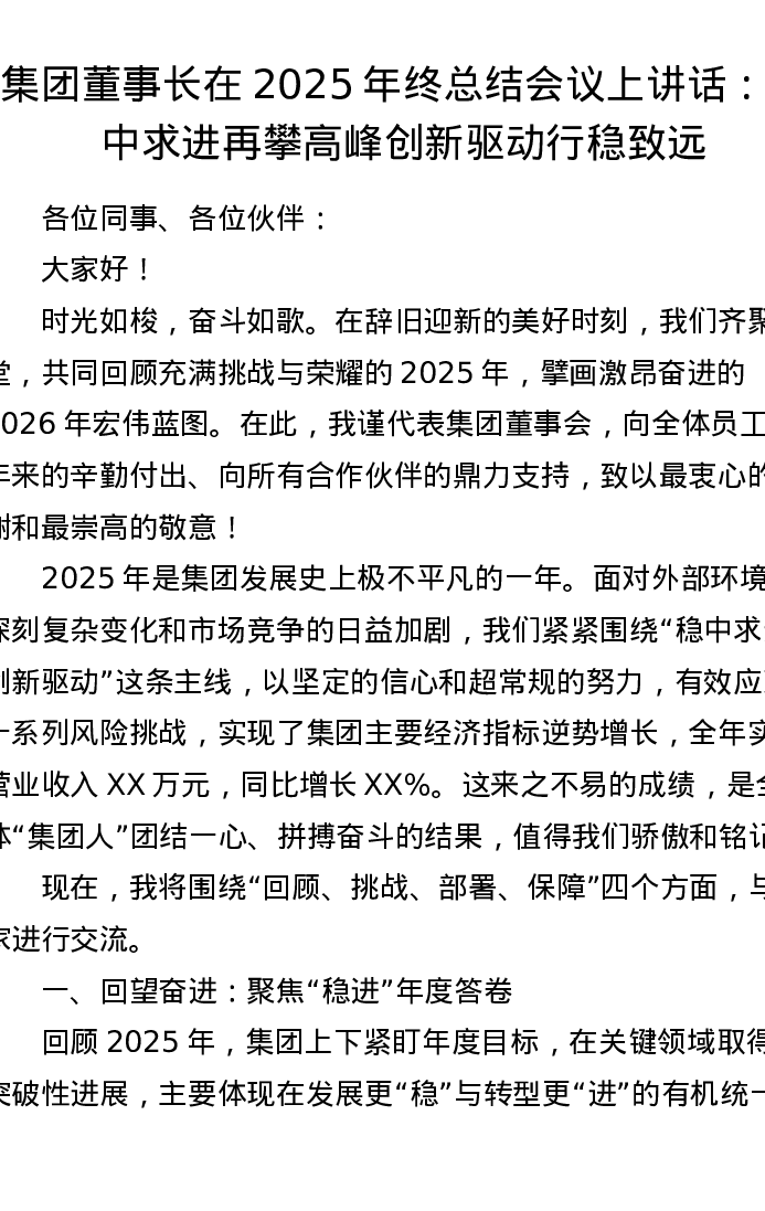 集团董事长在2025年终总结会议上讲话:稳中求进再攀高峰 创新驱动行稳致远