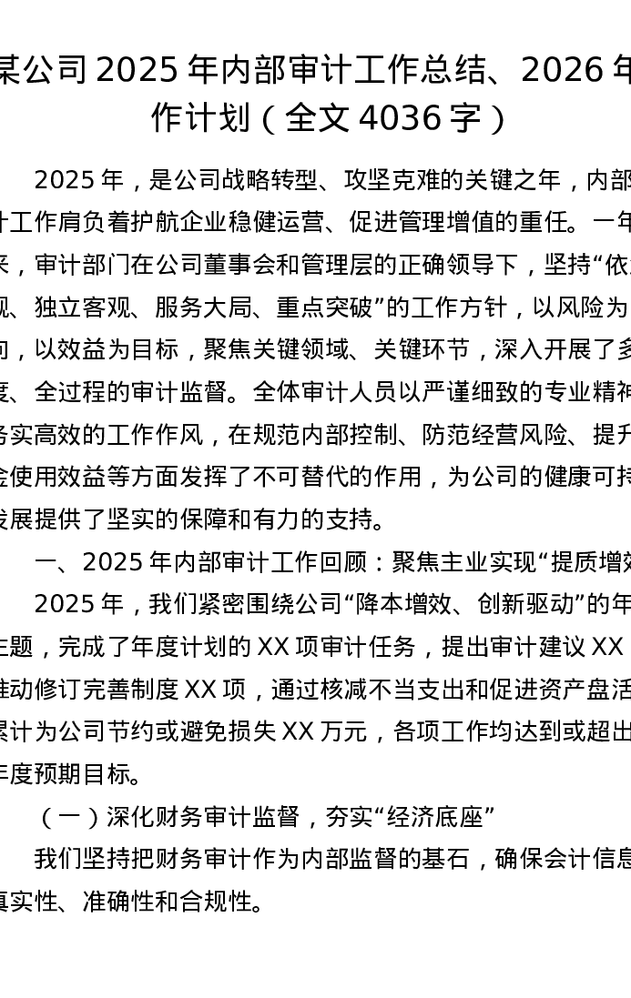 某公司2025年内部审计工作总结、2026年工作计划(全文4036字)