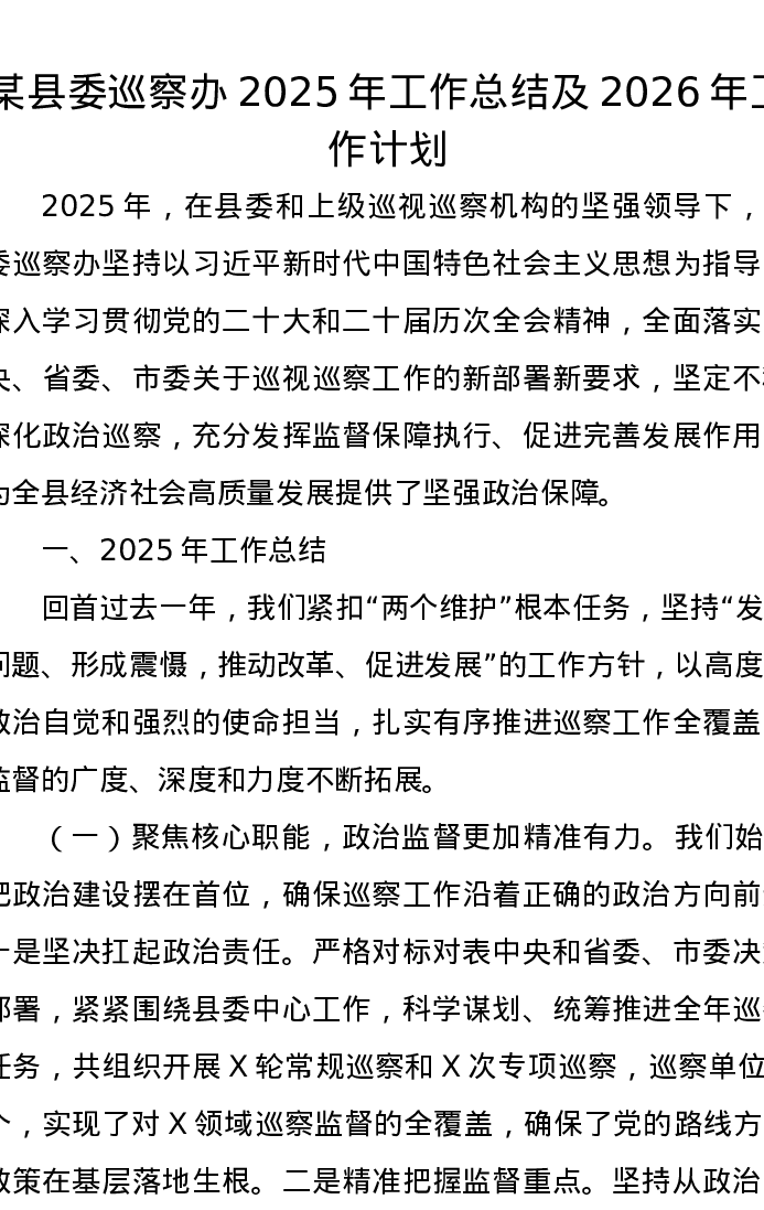 某县委巡察办2025年工作总结及2026年工作计划