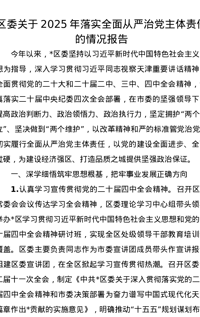 区委关于2025年落实全面从严治党主体责任的情况报告