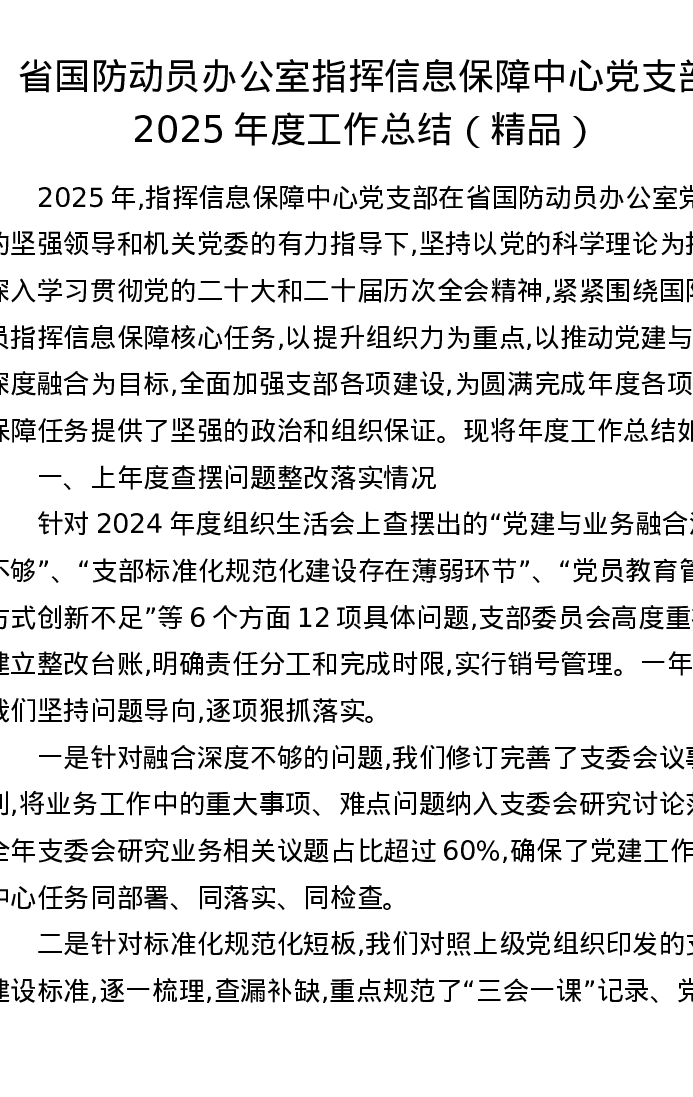 省国防动员办公室指挥信息保障中心党支部2025年度工作总结