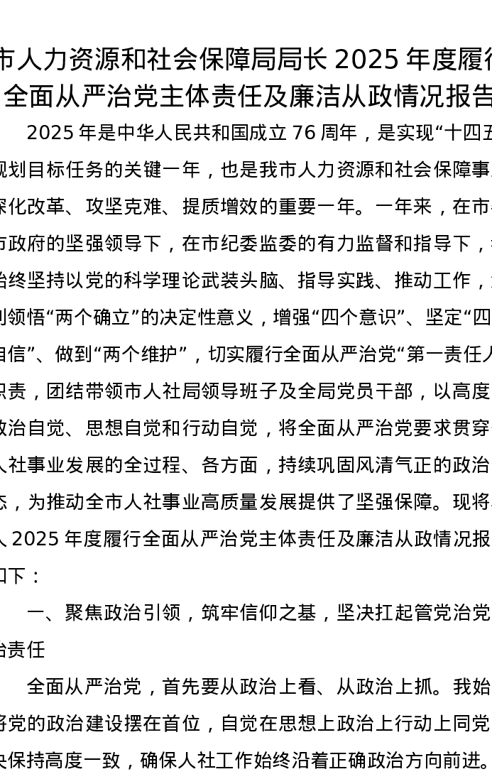 市人力资源和社会保障局局长2025年度履行全面从严治党主体责任及廉洁从政情况报告