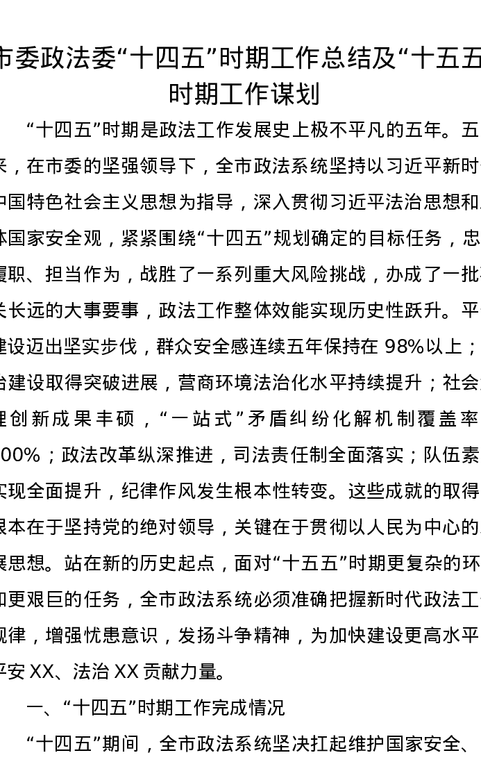 市委政法委“十四五”时期工作总结及“十五五”时期工作谋划