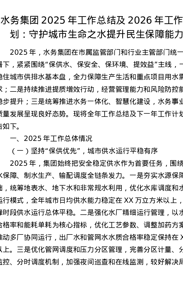 水务集团2025年工作总结及2026年工作计划:守护城市生命之水 提升民生保障能力