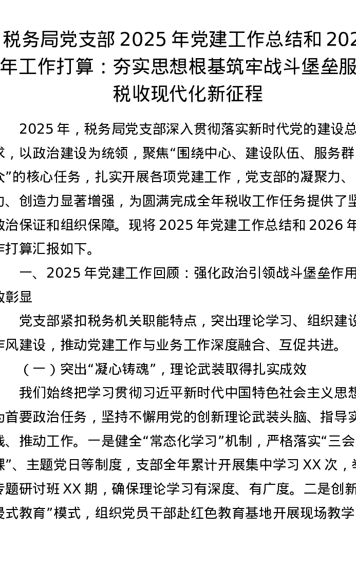 税务局党支部2025年党建工作总结和2026年工作打算:夯实思想根基筑牢战斗堡垒 服务税收现代化新征程