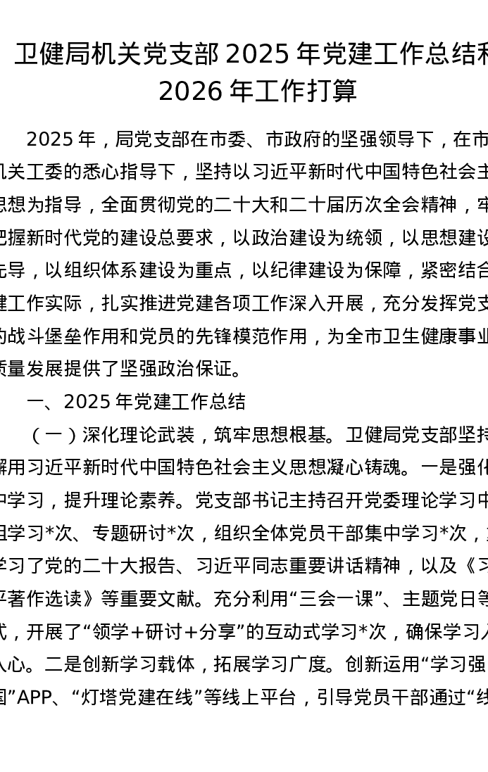 卫健局机关党支部2025年党建工作总结和2026年工作打算