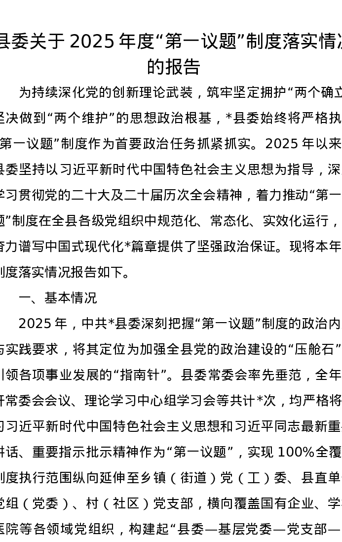 县委关于2025年度“第一议题”制度落实情况的报告