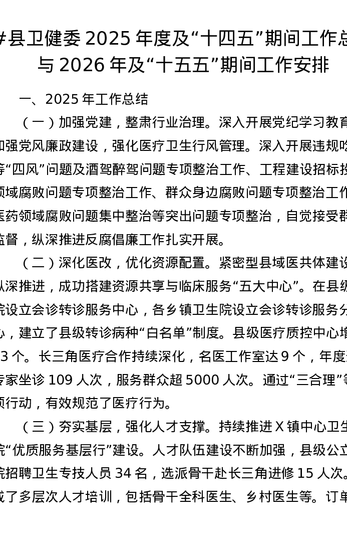县卫健委2025年度及“十四五”期间工作总结与2026年及“十五五”期间工作安排