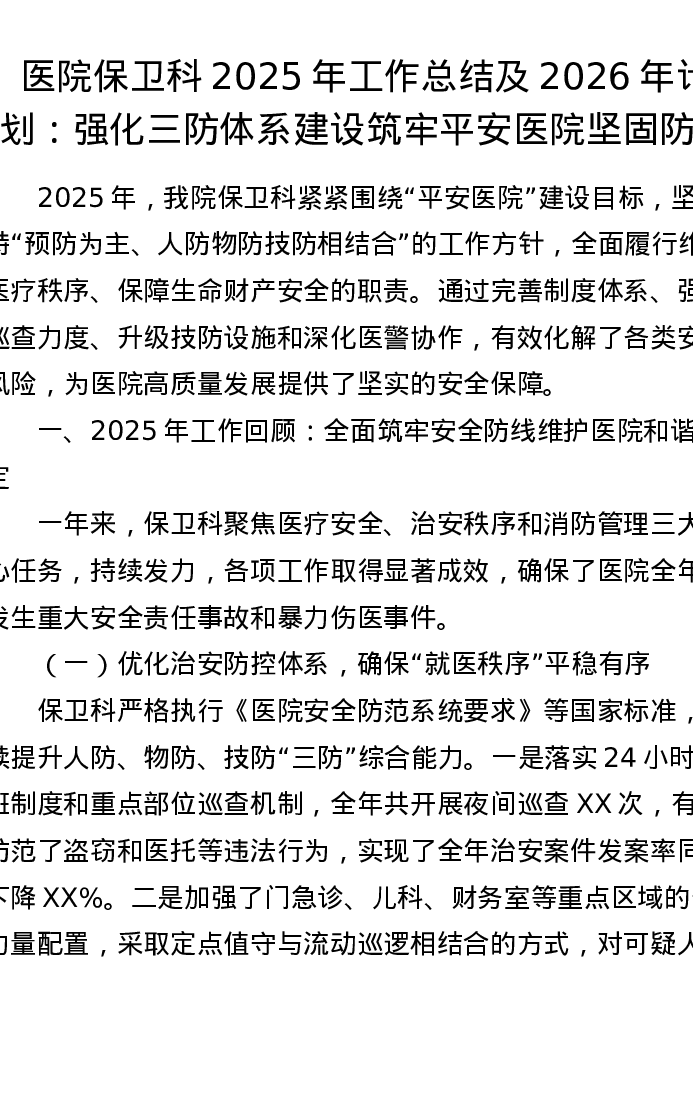 医院保卫科2025年工作总结及2026年计划:强化三防体系建设 筑牢平安医院坚固防线