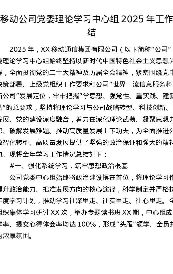 移动公司党委理论学习中心组2025年工作总结(4617字)