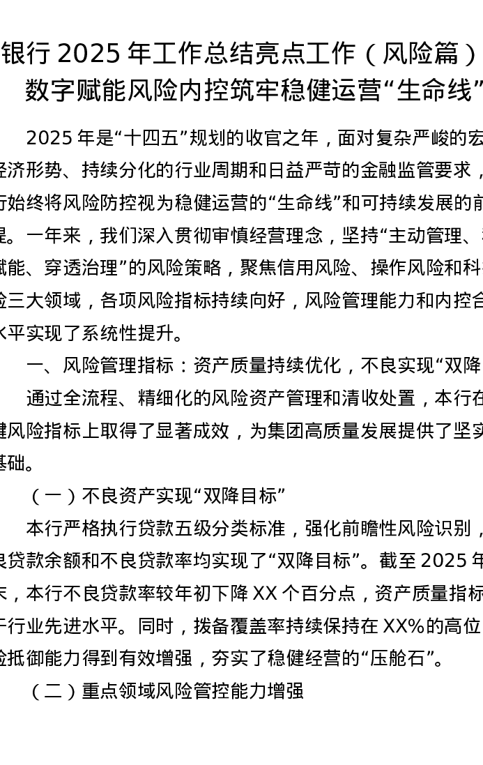 银行2025年工作总结亮点工作(风险篇):数字赋能风险内控 筑牢稳健运营“生命线”