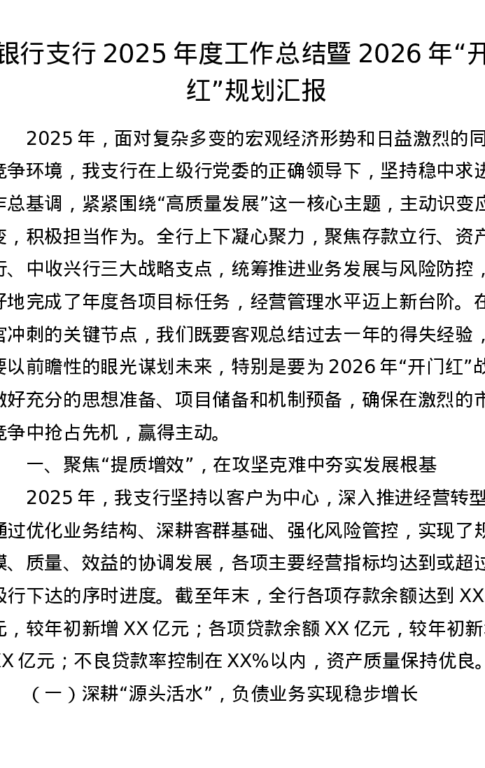 银行支行2025年度工作总结暨2026年“开门红”规划汇报