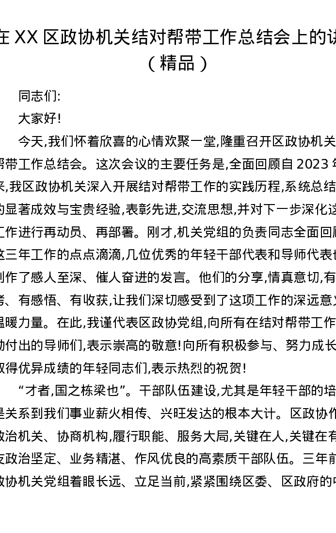 在XX区政协机关结对帮带工作总结会上的讲话