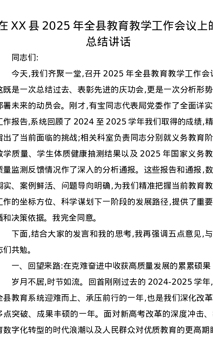 在XX县2025年全县教育教学工作会议上的总结讲话