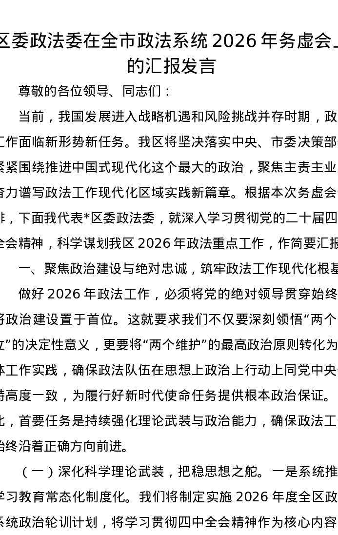 区委政法委在全市政法系统2026年务虚会上的汇报发言