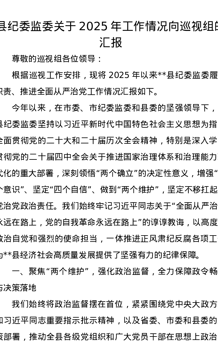 县纪委监委关于2025年工作情况向巡视组的汇报