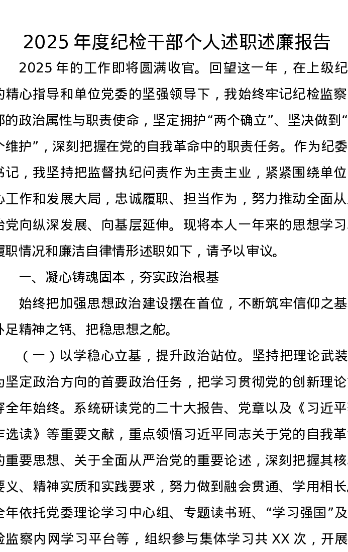 2025年度纪检干部个人述职述廉报告