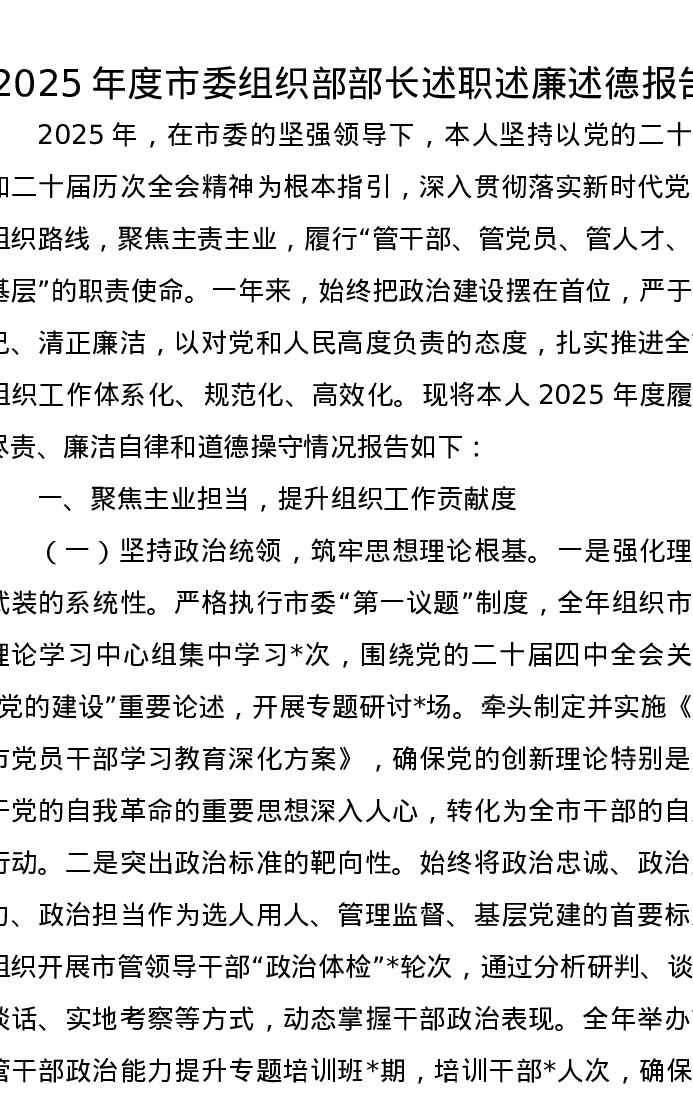 2025年度市委组织部部长述职述廉述德报告