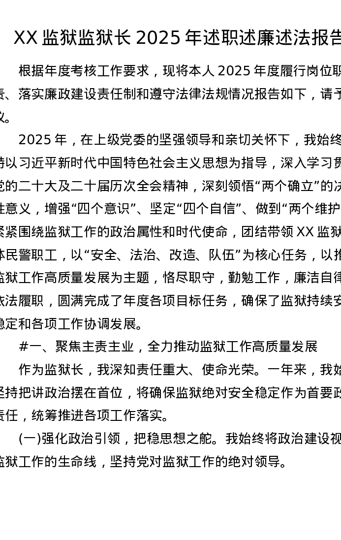 XX监狱监狱长2025年述职述廉述法报告(4498字)
