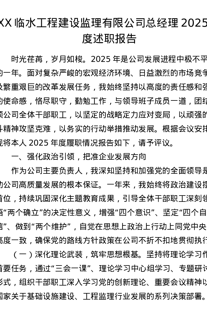 XX临水工程建设监理有限公司总经理2025年度述职报告(3749字)