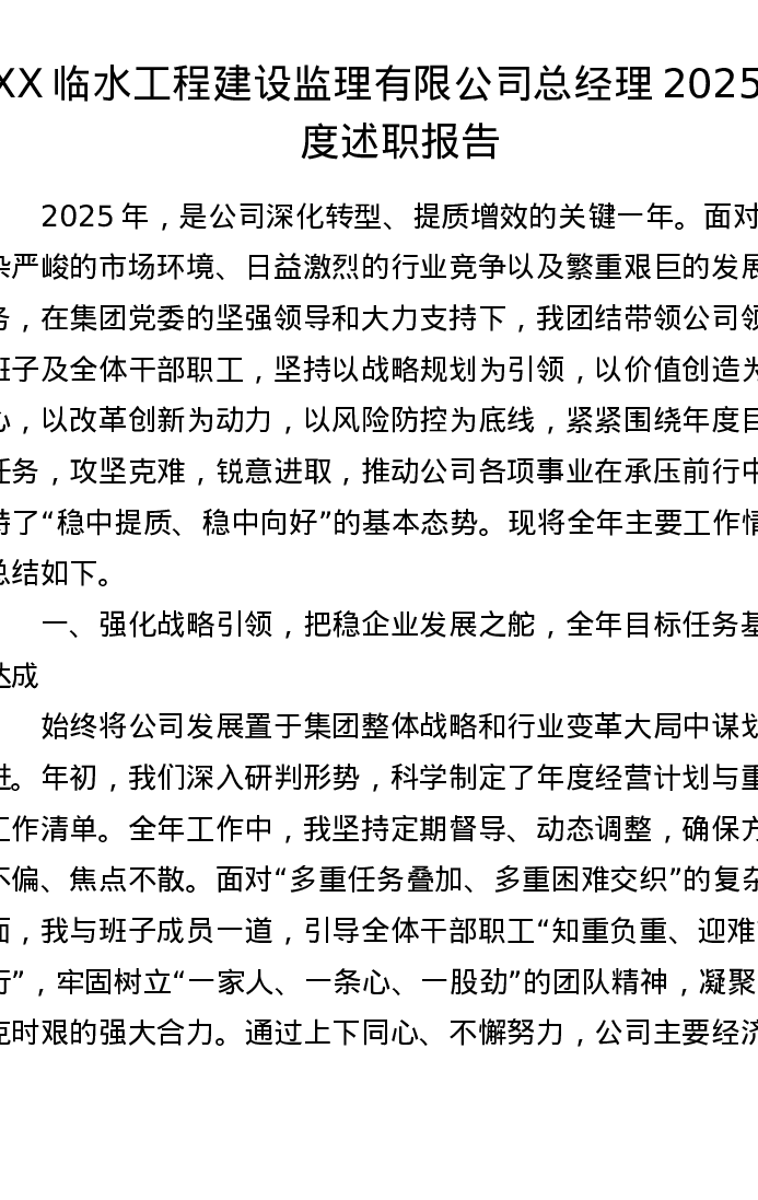 XX临水工程建设监理有限公司总经理2025年度述职报告