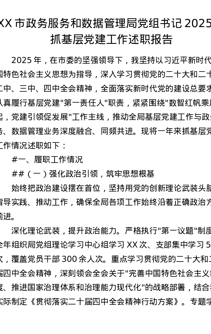 XX市政务服务和数据管理局党组书记2025年抓基层党建工作述职报告