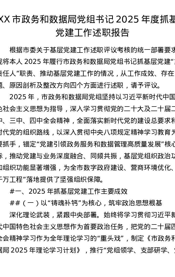 XX市政务和数据局党组书记2025年度抓基层党建工作述职报告(5931字)