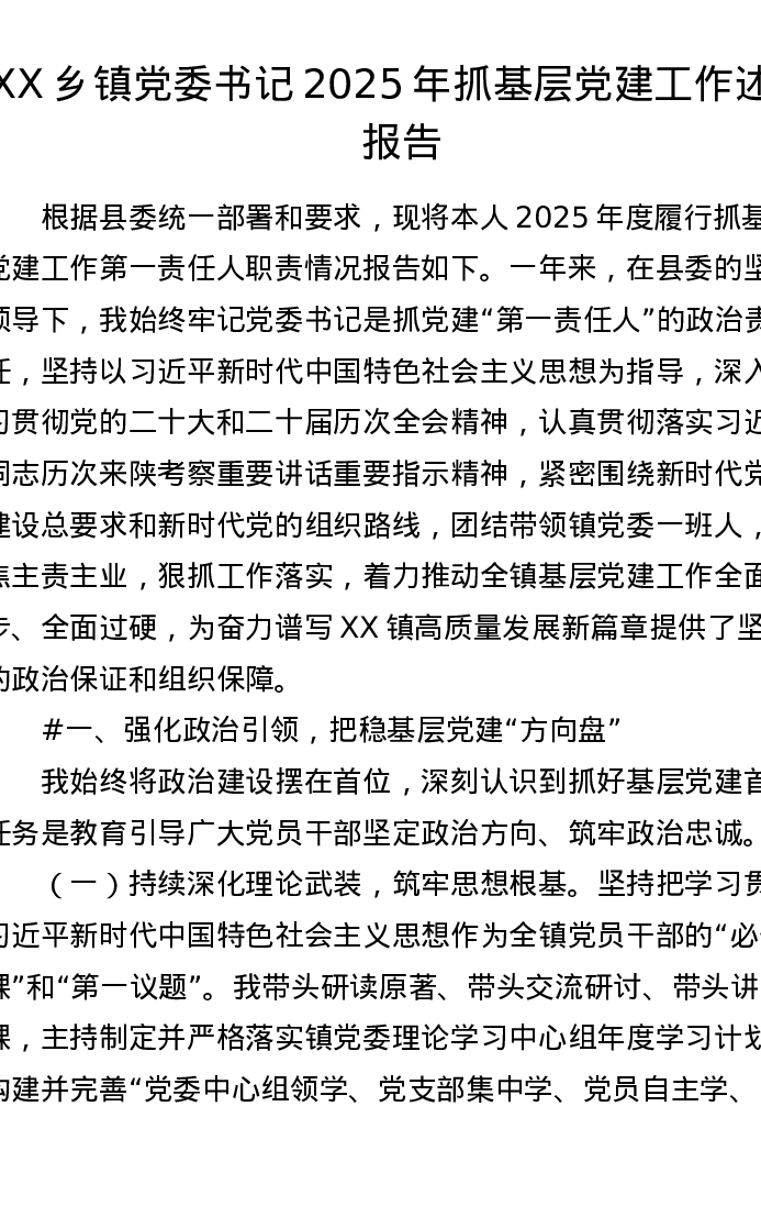 XX乡镇党委书记2025年抓基层党建工作述职报告(4584字)