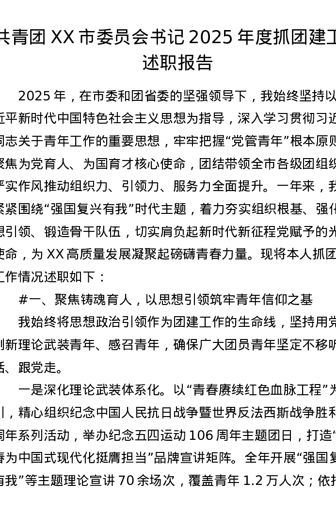 共青团XX市委员会书记2025年度抓团建工作述职报告(2817字)