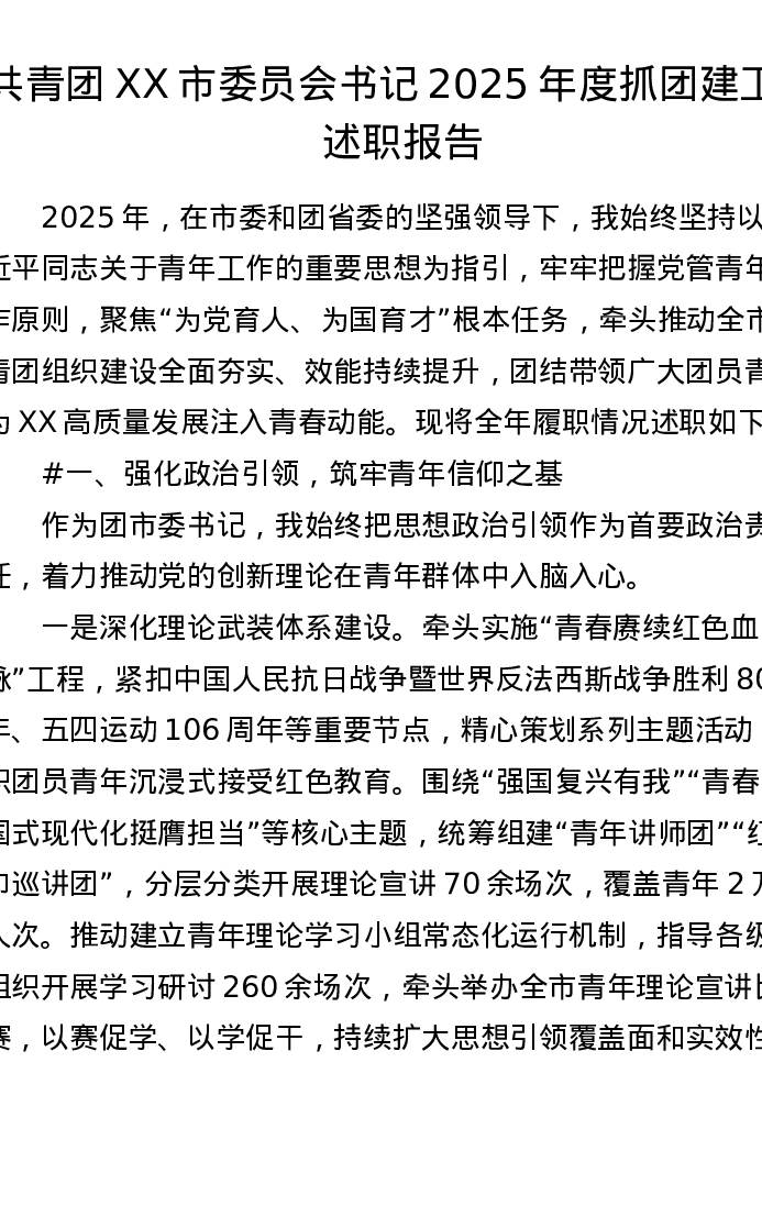 共青团XX市委员会书记2025年度抓团建工作述职报告(3426字)