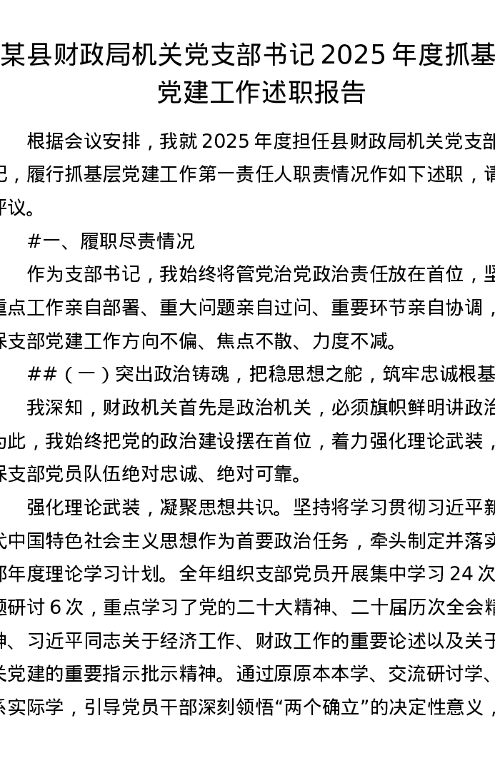 某县财政局机关党支部书记2025年度抓基层党建工作述职报告(6017字)