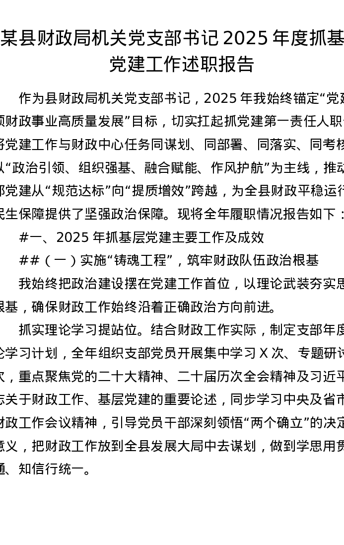 某县财政局机关党支部书记2025年度抓基层党建工作述职报告