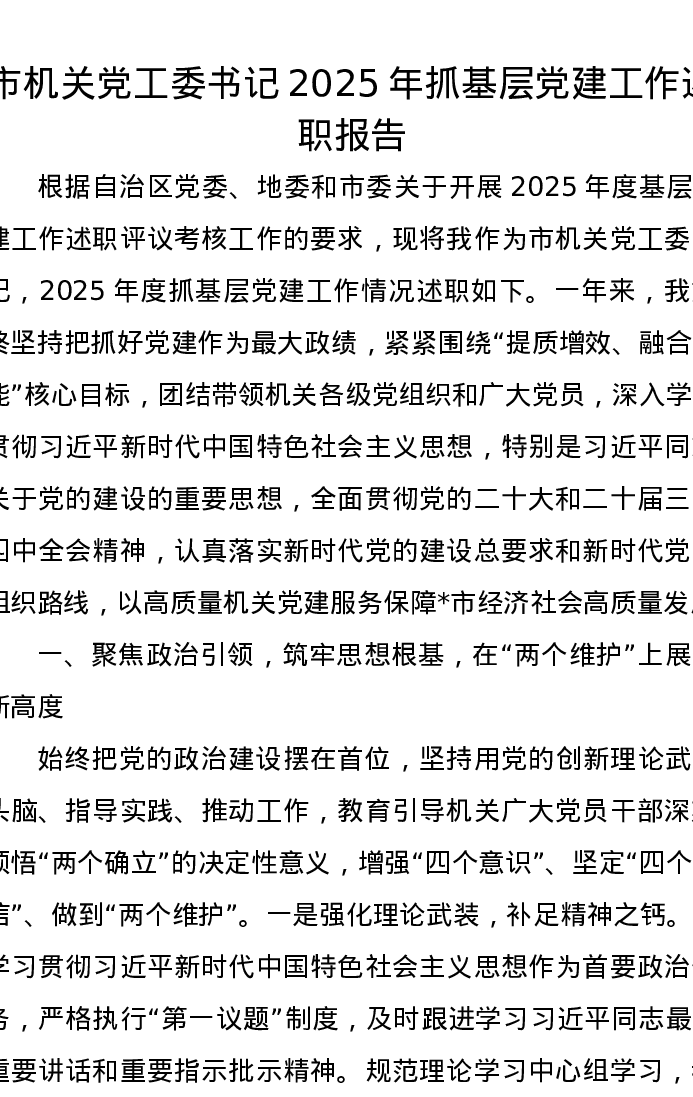 市机关党工委书记2025年抓基层党建工作述职报告