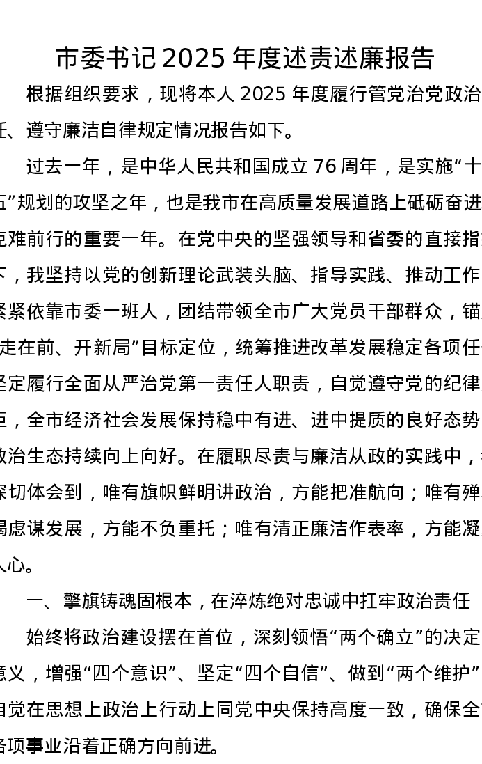 市委书记2025年度述责述廉报告