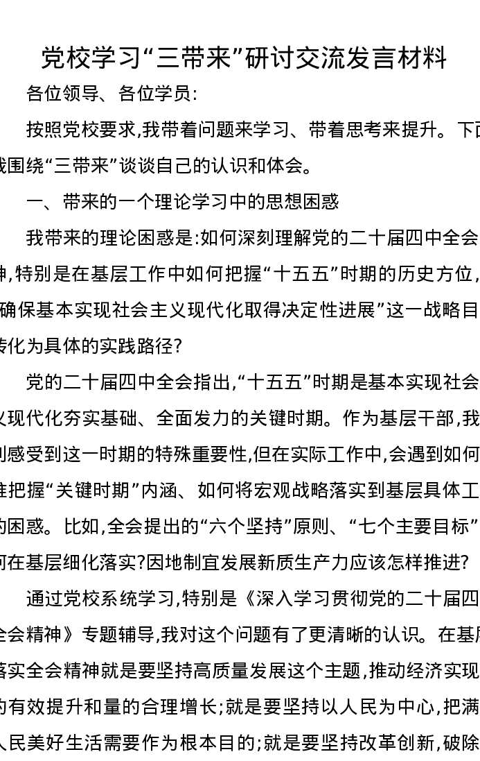 党校学习“三带来”研讨交流发言材料