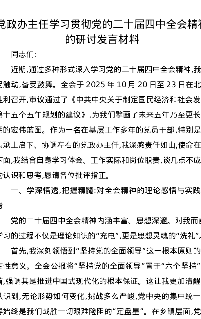 党政办主任学习贯彻党的二十届四中全会精神的研讨发言材料