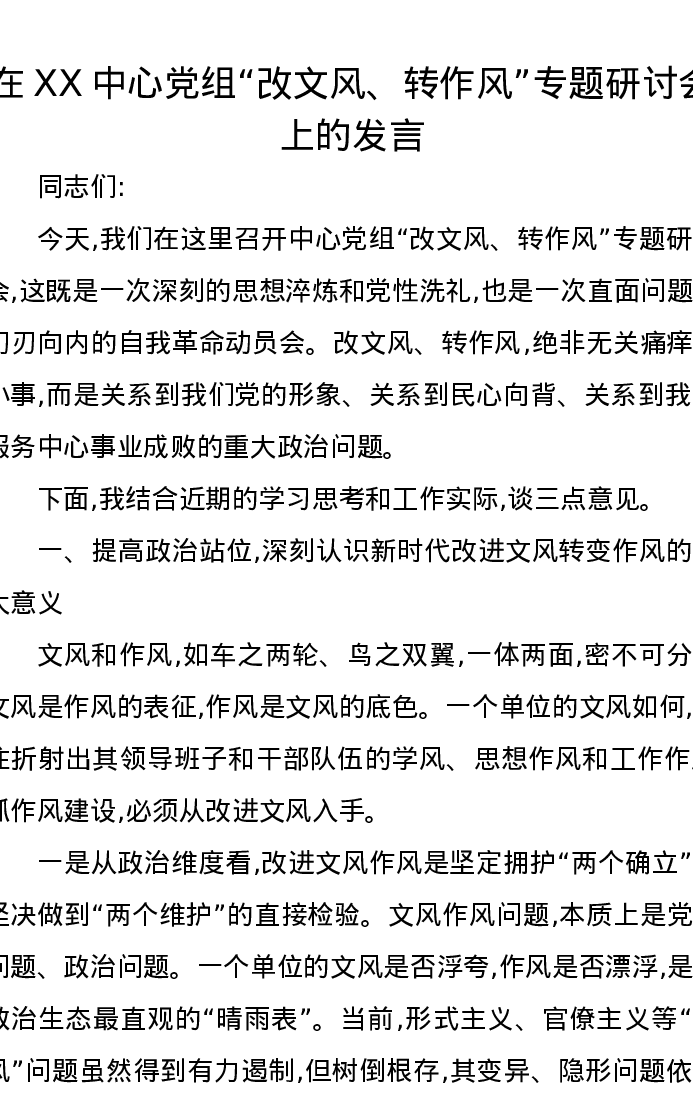 在XX中心党组“改文风、转作风”专题研讨会上的发言
