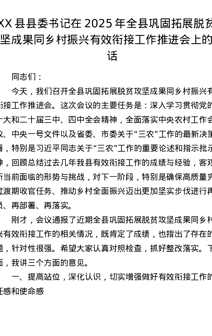 XX县县委书记在2025年全县巩固拓展脱贫攻坚成果同乡村振兴有效衔接工作推进会上的讲话