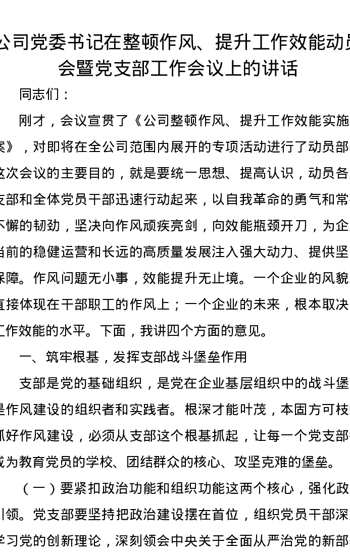 公司党委书记在整顿作风、提升工作效能动员会暨党支部工作会议上的讲话