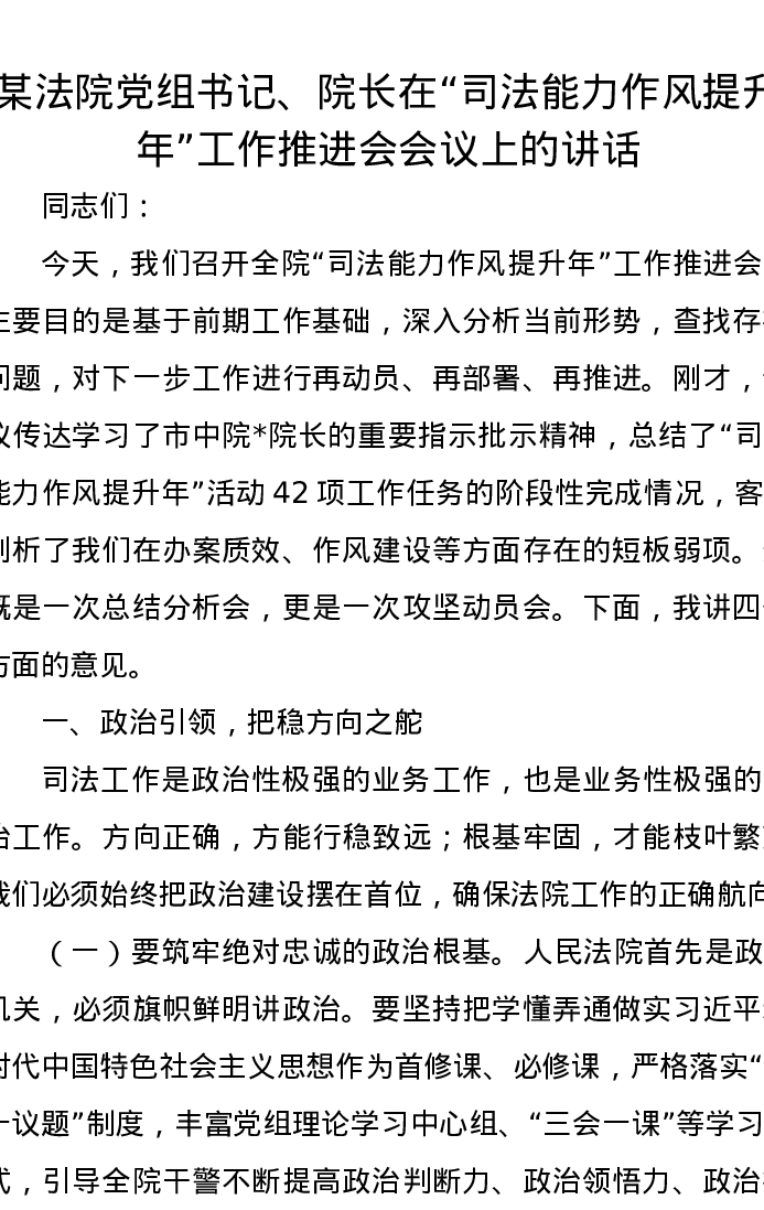 某法院党组书记、院长在“司法能力作风提升年”工作推进会会议上的讲话