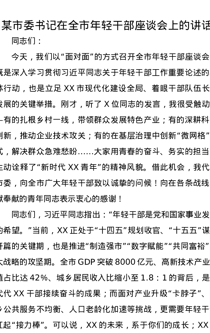 某市委书记在全市年轻干部座谈会上的讲话