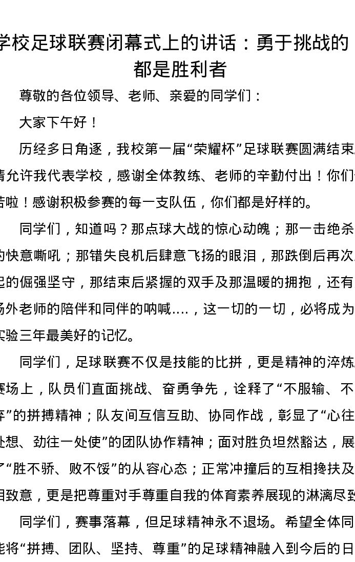 学校足球联赛闭幕式上的讲话:勇于挑战的,都是胜利者