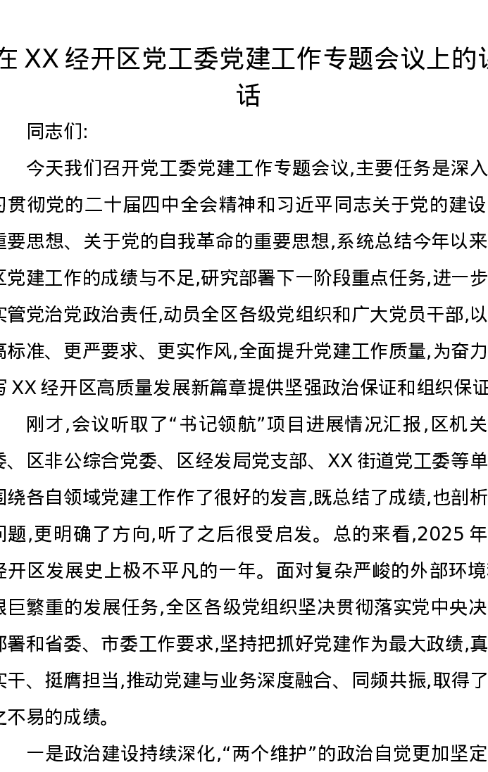 在XX经开区党工委党建工作专题会议上的讲话