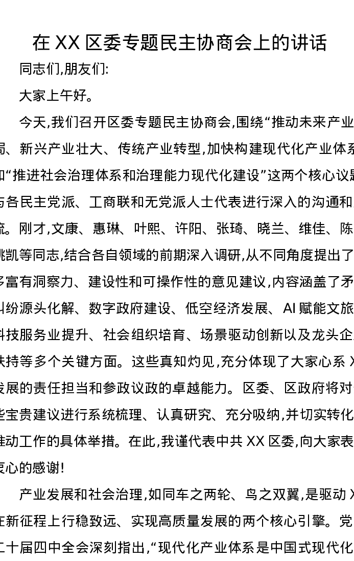 在XX区委专题民主协商会上的讲话