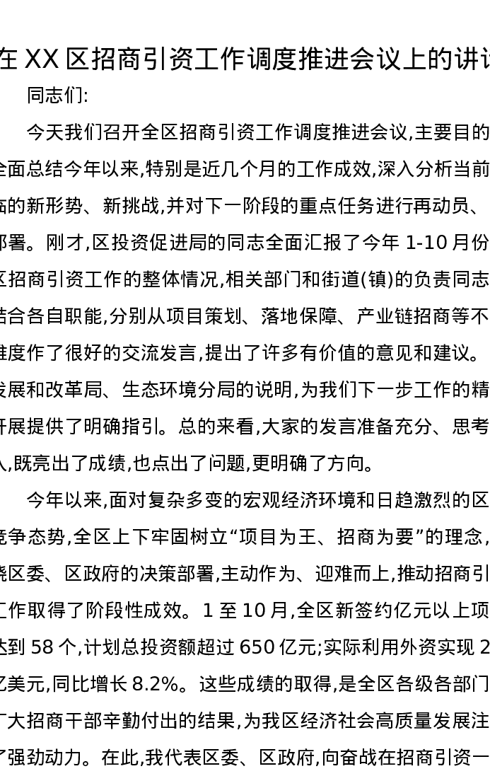 在XX区招商引资工作调度推进会议上的讲话